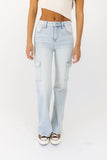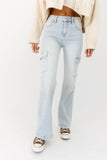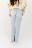 a trendy take on the classic cargo design, these light-wash denim cargo pants feature a relaxed high-waisted fit + pouch pockets. the perfect denim utility-inspired bottoms to wear with sneakers + boots, season after season.
