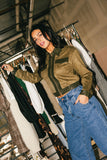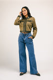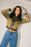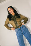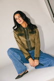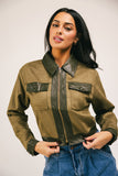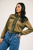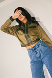 effortlessly edgy, this cropped collared jacket will take any outfit to the next level. featuring a moto-style silhouette with faux leather detailing, this olive green jacket is perfect for layering up or styling solo.