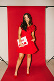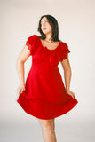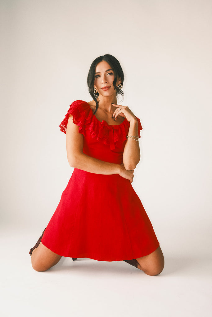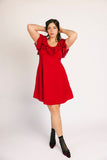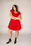 - red // mini length, scoop neckline, lace ruffle neckline + sleeves, front bow, lined, pockets, smocked back, hidden back zipper
