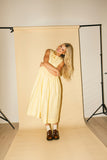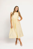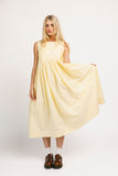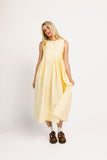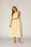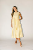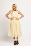 - butter yellow // midi length, scoop neckline, back zipper closure, lined, pockets, pleated bodice