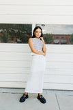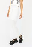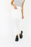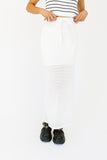 - white // maxi length, elastic waistband, front tie, side slit, lined to knee