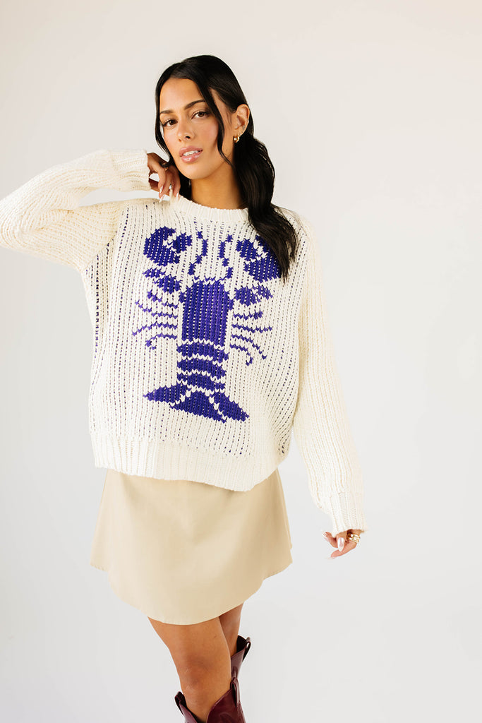 a soft + buttery lobster knit sweater? yum, don’t mind if i do. this lightweight slouchy sweater has a lived-in luxury feel + features the cutest navy blue lobster on the front. a cozy coastal essential, it’s perfect to throw on with any outfit, season after season.
