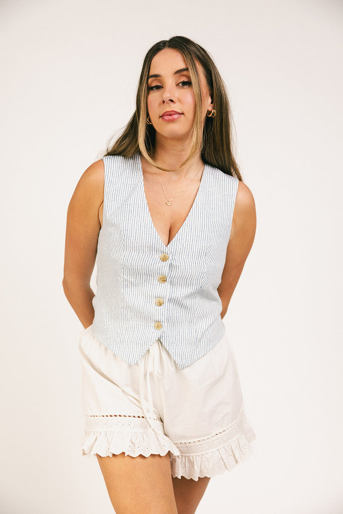 a classic top with coastal energy, this blue + white striped vest will take you from day to night, all season long. with its slightly cropped silhouette + gold button details, it’s perfect for layering up or styling solo. pair it with shorts + flats for casual hangs, or trousers + heels for fancier outings.