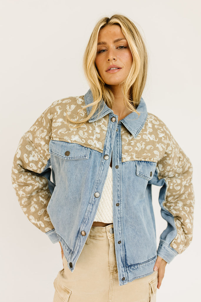 - denim + taupe // collared, mixed fabric, pockets, snap buttons, cuffed sleeves, quilted sleeves