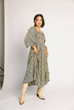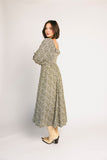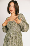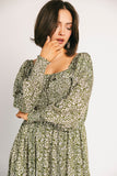 chic + comfortable, this long sleeve green floral midi dress has a timeless feel with a hint of vintage energy. the perfect dress for any occasion, you can style it with heels for fall + winter weddings, or knee high boots for family pictures.