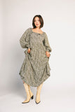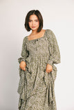 - olive // midi length, square neckline, smocked bodices, front tie, ruffle detail, balloon sleeves, smocked cuffs, elastic neckline, lined to thigh