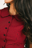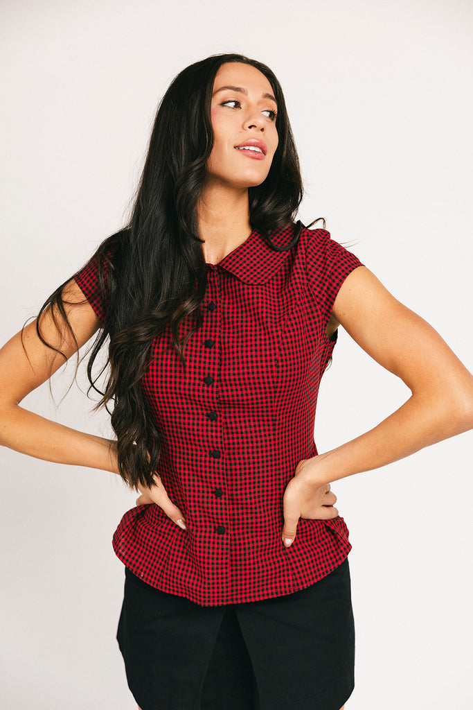 both timeless + chic, this red + black gingham top instantly elevates any outfit. featuring a fitted silhouette + a classic collared neckline, it’s the perfect elevated basic to dress up for fancy outings, or down for casual hangs.