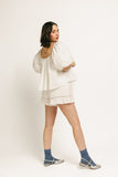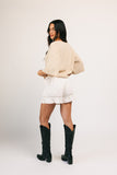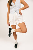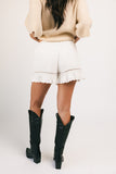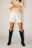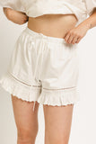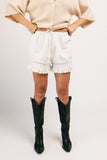 frilly, flattering, + totally foolproof, these lightweight white shorts are full of cute outfit possibilities. they have a comfortable drawstring waist + a dainty ruffled hemline, so they’re great for lounging around + hitting the town. the perfect cotton shorts to pair with tanks, tees, blouses, + sweaters.