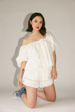 - white // high rise, elastic waistband, tie front, attached lining, eyelet lace detailing, scallop hem