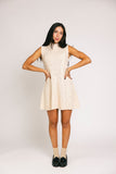 fun + flirty, this sleeveless sweater dress is the perfect ‘throw on + go’ situation for fall + winter. it features a chic mockneck + classic cable knit details. full of versatility, it’s a knit mini dress you can pair with loafers, boots, + everything in between.
