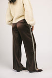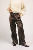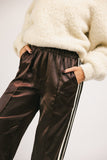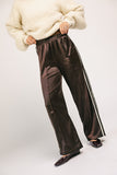 vintage-style track pants– but make them ultra chic. these brown satin bottoms will take you from busy days out, to cozy days in. featuring sporty track stripes + sleek seam detailing, they’re the perfect casual pants to dress up or down, season after season.