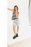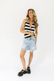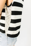 - black, white, + taupe stripes // collared, v-neckline, mixed fabric