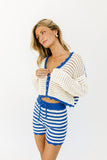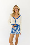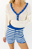 - cream + blue // two piece set, v-neckline, buttons, cropped, eyelet detailing, elastic waistband, adjustable drawstring, lined shorts, scallop hem