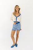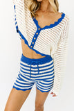 your new go-to summer outfit, this cream + navy crochet set is made for beach days + vacays. it’s detailed with royal blue stripes + trendy scallop hemming to give off those coveted euro girl summer vibes. the only crochet two piece set you’ll want to wear this season.