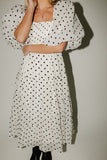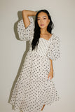 - off white base + black polka dot // midi length, square neck, smocked, puff sleeve, pockets, back zipper, fully lined, organza