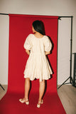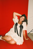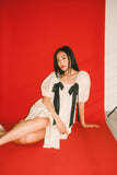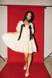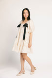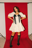 - cream + bows // puff sleeves, knee length, tiered skirt, scoop elastic neckline, black satin bows, pockets, lined
