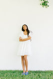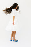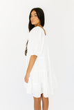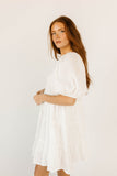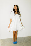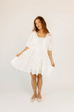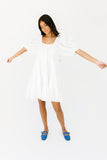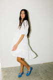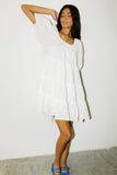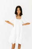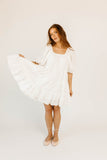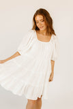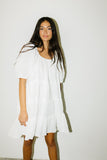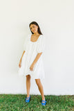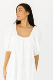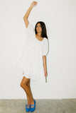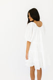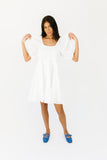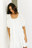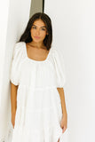 - white // puff sleeve, knee length, tiered skirt, scoop elastic neckline, lined, high low skirt