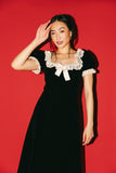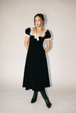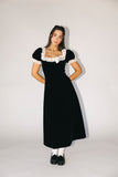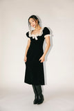 super sweet + a little bit sultry, this vintage-inspired dress was made for holiday parties, fancy dinner dates, + everything in between. it features a sleek silhouette with a lacey, feminine neckline + a dainty bow detail. a timeless beauty, it’s the perfect black velvet midi dress for every special occasion.