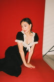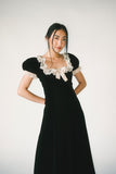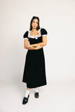 - black // midi length, square neckline, puff sleeves, elastic cuffs, lace neckline + cuffs, satin front bow, hidden back zipper, back slit, lined