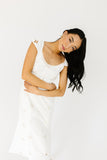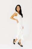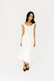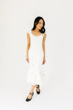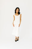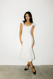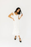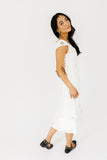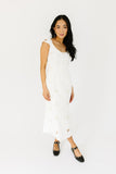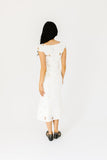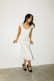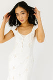 - white // midi length, sweetheart neckline, cap sleeves, front buttons, enlarged eyelet detailing, side slit, removable slip not included