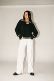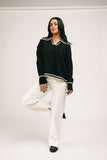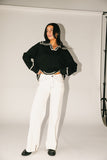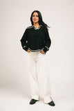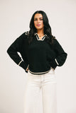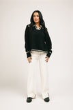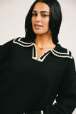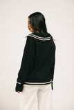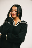 cozy + flirty, this black vintage-inspired sweater is a winter wardrobe essential. with its soft, slouchy shape + dainty scalloped details, it’s the perfect collared sweater to dress up or down for any occasion.