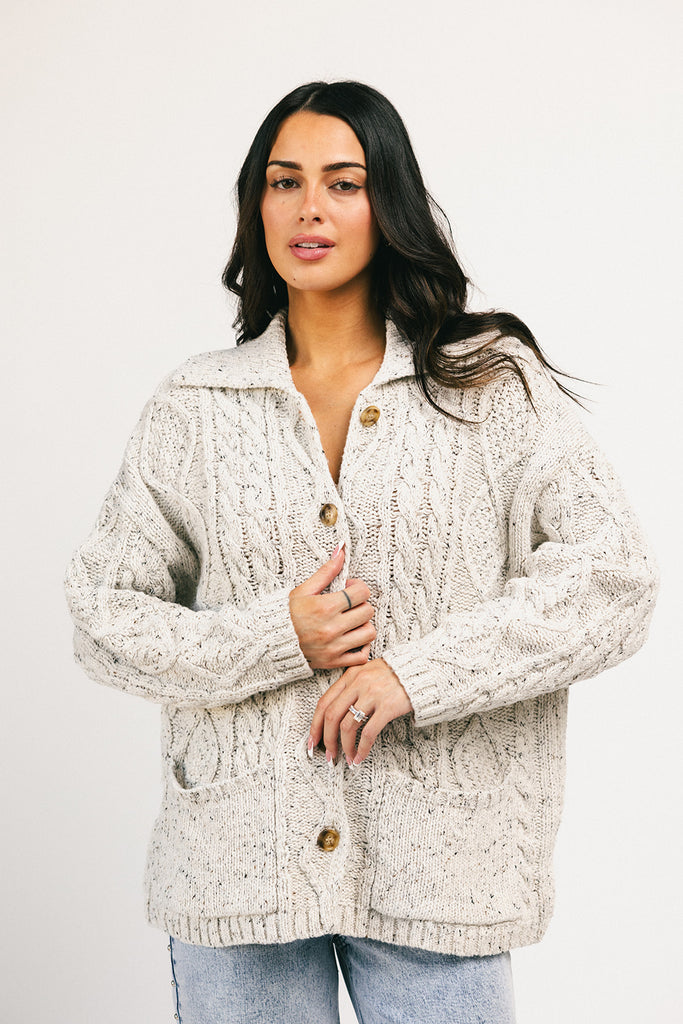 a grey cable knit cardigan with chic, rustic vibes. it has a cozy, oversized fit with a collar + slouchy front pockets. the perfect addition to any casual outfit, we love it layered over tanks + tees, or styled solo with baggy denim.