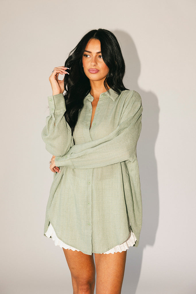 this oversized green button up top is flowy, flirty, + full of cute outfit possibilities. an essential for every season, you can pair it with a skirt + heels for work lunches, or shorts + flats for casual date nights.