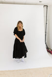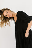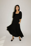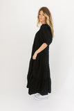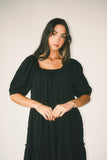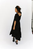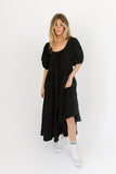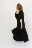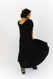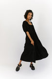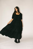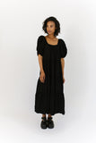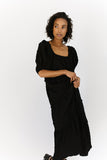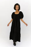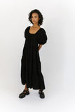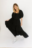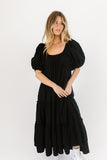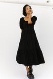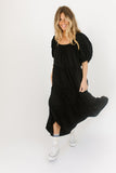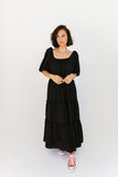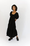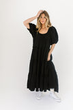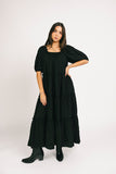 - black // maxi length, puff sleeve, tiered skirt, elastic scoop neckline, pockets