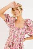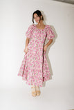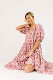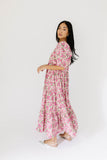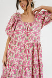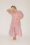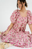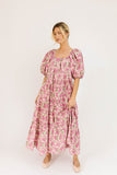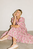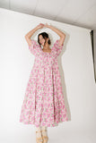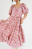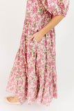 - pink floral // maxi length, puff sleeve, tiered skirt, elastic scoop neckline, pockets