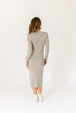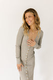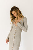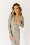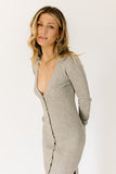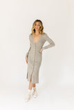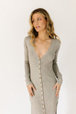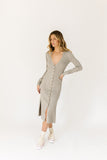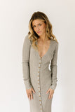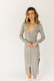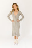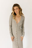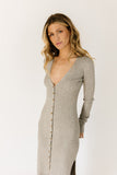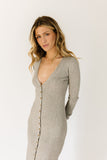 - heather grey // midi length, deep v-neckline, buttons, side slits, ribbed