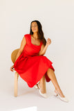 - red // midi length, square neckline, adjustable tie sides, lined to knee, double lined bodice, pockets, elastic waistband