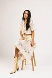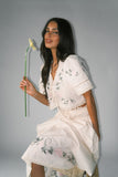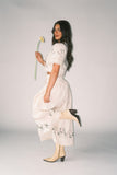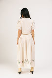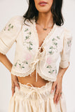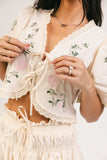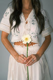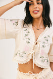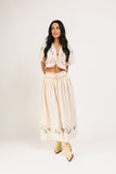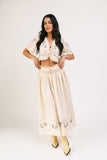 - cream // v-neckline, double tie front, cropped, maxi length, double elastic waistband, double tie waist, pockets, lace trim detailing, floral embroidery