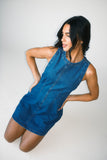 - dark denim // mini length, high neckline, back zipper closure, seam detailing, darts
