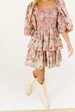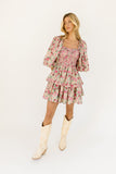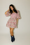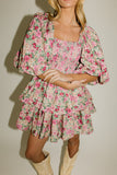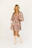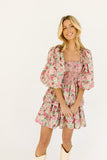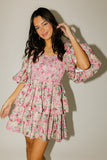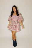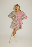 - pink multicolor floral // mini length, square neckline, smocked bodice, back zipper closure, dramatic balloon sleeves, ruffle skirt