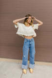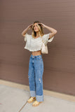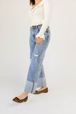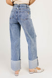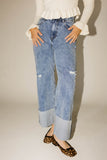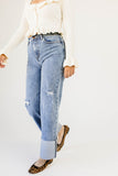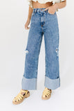 a versatile essential, these straight leg high waisted jeans will take you from day to night, season after season. featuring subtle distressed details + a thick folded hem, this vintage-inspired denim is what outfit dreams are made of.