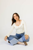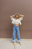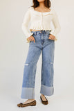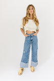 - washed denim // high waisted, distressed details, one button zip fly, folded sewn hem, wide leg, pockets