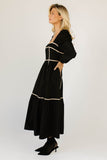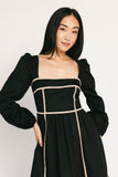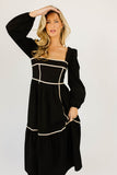 turn heads + drop jaws with this chic long sleeve midi dress. featuring a feminine square neckline + a flirty bodice with sleek beige trim details, this black midi dress fits + flatters in all the right ways. a must-have for cocktail parties, fall // winter weddings, + anything that calls for something suave.