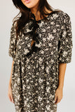 flowy + flirty, this black puff sleeve midi dress is a serious wardrobe game-changer. featuring a chic black + cream floral pattern + dainty bow tie details, this timeless dress will take you from day dates to evening soirées, season after season.