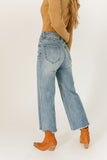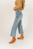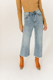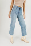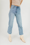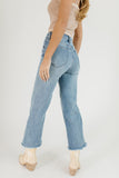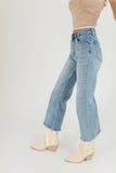 - medium wash // slight flare, cropped, pockets, one button zip fly, belt loops, frayed hem