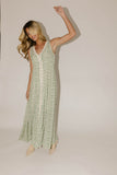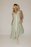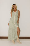- fern // v-neckline, maxi length, buttons, front slit, smocked back waist, tie back closure, lined to thigh, eyelet lace detailing