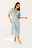 - denim // midi length, deep v-neckline, puff sleeves, elastic cuffs, back zipper closure, seam detailing