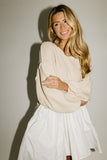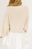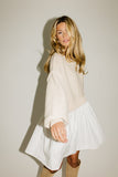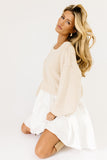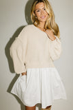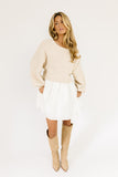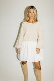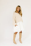 the perfect outfit all on its own, this mixed material sweater + dress combo is a zoco hunny essential. the top is a slouchy tan knit sweater that layers perfectly over a full + flowy white skirt. whether you dress it up or down, it’s guaranteed to cause some serious outfit envy.