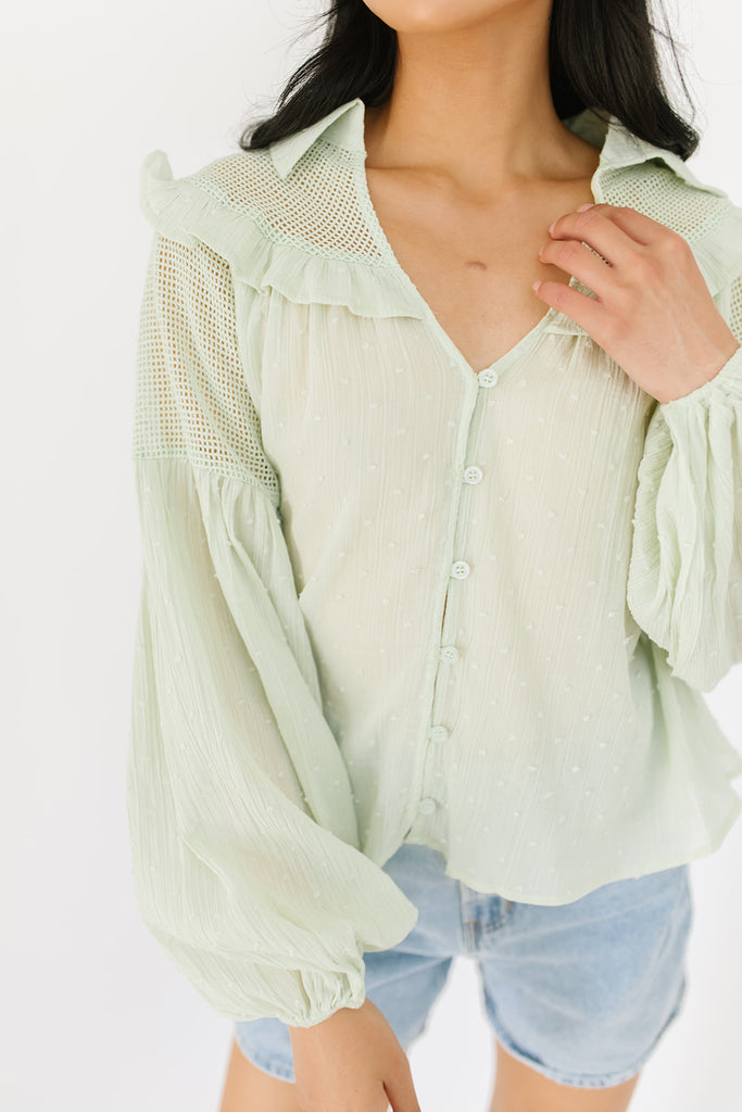 - tea green // collared, working buttons, balloon sleeves, sheer fishnet across shoulder