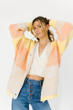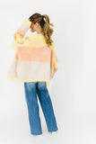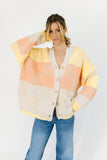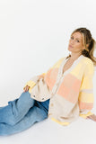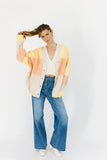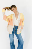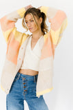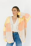 - peach + yellow + cream plaid stripes // v-neckline, drop shoulder, balloon sleeves, buttons