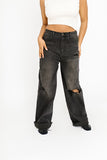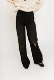 - black // high waisted, wide leg, one button zip fly, belt loops, pockets, raw hem, heavy distressing throughout