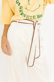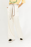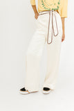 - cream // wide leg, back zipper closure, removable tie, belt loops, working pockets