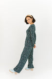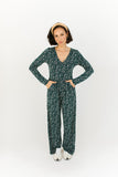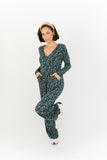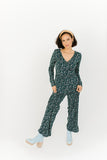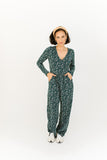 - teal + white floral // jumpsuit, wrap v-neckline, snap button closure, elastic waist, pockets