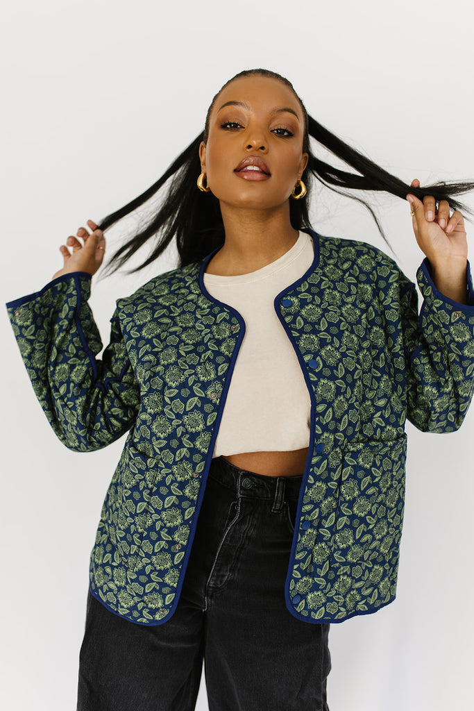 - navy + green // quilted, scoop neckline, snap buttons, pockets