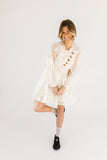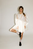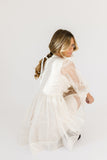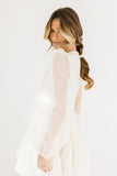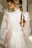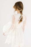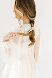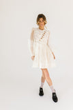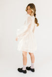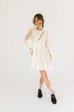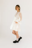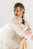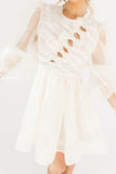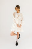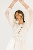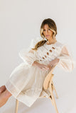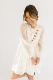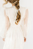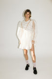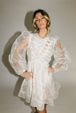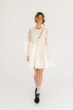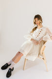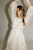 - off white // scoop neckline, diagonal bows across bodice, eyelet detailing, sheer puff sleeves, elastic cuffs, back zipper closure, pockets, lined skirt, shimmery gold stitching throughout