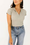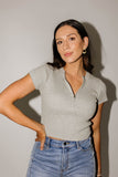 the perfect combination of classy + comfortable, this short sleeve grey zip-up top is full of styling possibilities. whether you’re going out or staying in, you can throw it on + rest assured that your fit is fab. a must-have for any casual spring // summer outfit.
